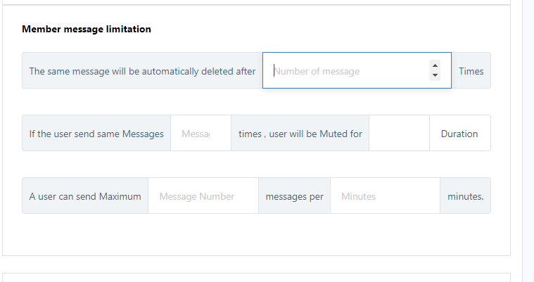 Member message limitation: This feature allows you to configure the automatic deletion of repetitive messages after a specified number of uses. Additionally, you can set up an automated mute function for users who excessively send the same message, with the ability to define the duration of this mute.